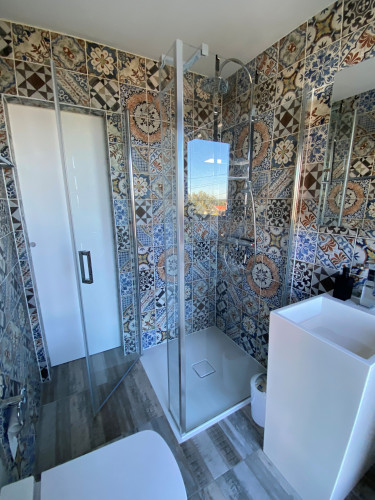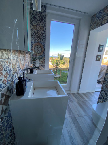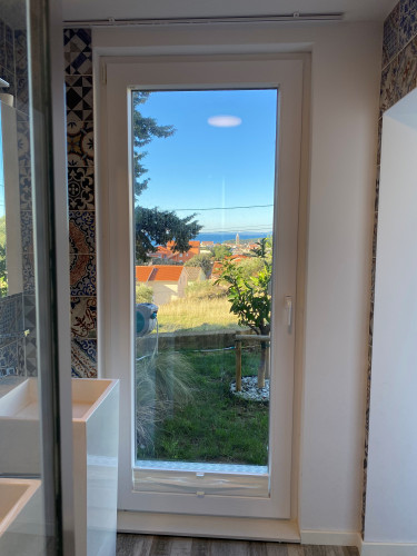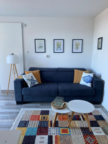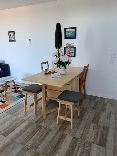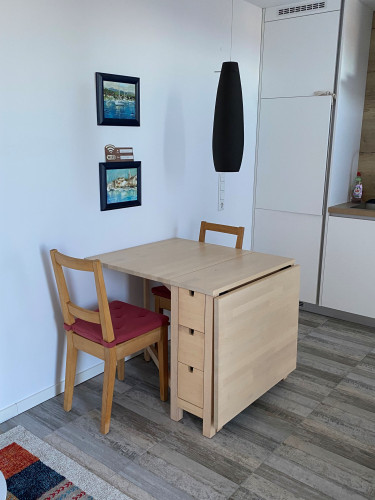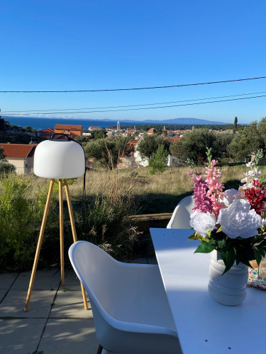 Die moderne, klimatisierte 2‑Zimmer‑Nichtraucher-Ferienwohnung (50qm²) liegt im Erdgeschoss eines Einfamilienhauses in Banjol. Der Zugang befindet sich über Ihre eigene Terasse, die Sie zum Essen und Verweilen einlädt. Durch die Hanglage geniessen Gäste einen fantastischen Blick auf das Meer, die Altstadt von Rab sowie auf die Insel Cres/ Lošinj. Die Wohnung ist ideal für 2–4 Personen geeignet und verfügt über ein Schlafzimmer mit Doppelbett sowie ein komfortables Schlafsofa (Matratze) im Wohnzimmer.