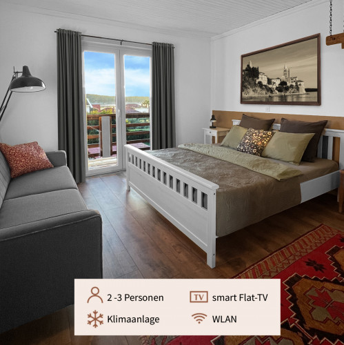 Das Doppelzimmer Nr. 2 ist eingerichtet für bis zu 4 Personen inklusive Schlafcouch und befindet sich im Obergeschoss der Villa Olea. Die bodentiefen Fenster zum eigenen sonnigen Balkon mit Markise und Balkonmöbel bieten einen schönen Ausblick auf die Adria und den liebevoll gepflegten Garten. Das Doppelzimmer verfügt über ein eigenes modernes Duschbad. Kostenloser WLAN-Zugang. Mit Klima-Anlage und Smart-TV. Zusätzlich kann eine Gemeinschaftsküche, ein gemeinsamer Aufenthaltsraum und die wunderschöne große Dachterrasse mit Sonnenliegen genutzt werden.